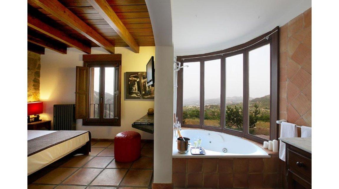 Hotel Alahuar es un hotel de 4 estrellas ubicado en las afueras de Benimaurell, coronando la Vall de Laguar. Es el escenario idóneo para los amantes de la montaña y de la naturaleza. Descubrirás rincones apasionantes de la provincia de Alicante paseando por preciosos senderos locales. Si tienes espíritu aventurero, podrás adentrarte en el apasionante Barranc del Infern, considerado por muchos una de las mejores rutas de senderismo de la Comunidad Valenciana. Pero no todo es aventura en el Hotel Alahuar, también podrás relajarte en una de nuestras habitaciones con bañera hidromasaje o tomar una copa de cava mientras degustas las riquísimas cerezas de la Vall de Laguar. Si te alojas en una de nuestras habitaciones o villas descubrirás por qué la Vall de Laguar es el escenario perfecto para una escapada romántica. Déjate sorprender por nuestros caprichos o elige nuestra habitación más romántica: la Junior Suite Rabet de Gat. Y si te mueve el paladar, te encantará la propuesta gastronómica de nuestro restaurante con productos “km.0”. Nuestro restaurante está abierto al público y en él puedes deleitarte con recetas tradicionales como el arroz al horno, los figatells o las cocas artesanales. Ven a Hotel Alahuar si quieres experimentar la conexión con la naturaleza y la sensación de estar lejos pero cerca.